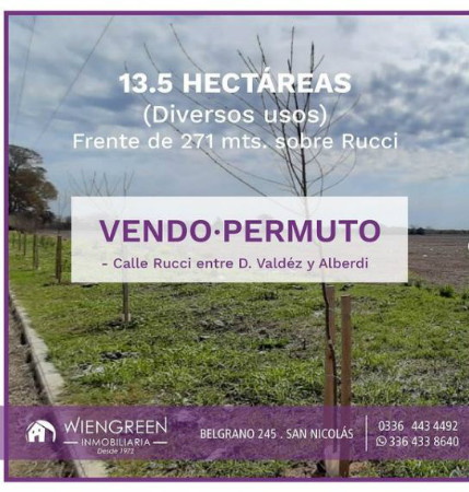 VENDO o PERMUTO 13.5 Hectáreas ( Diversos Usos ) Calle RUCCI entre Damaso Valdez y Alberdi. Frente de 271 mts. sobre Rucci