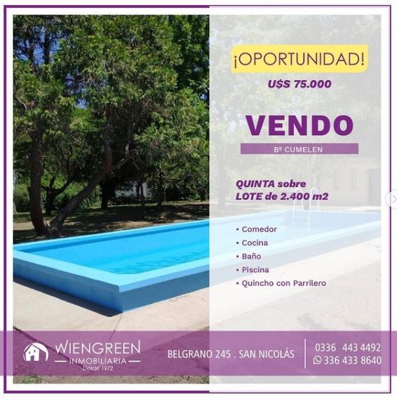 VENDO QUINTA sobre LOTE de 2400 m2 UBICADA en Bº CUMELEN Consta de: Comedor Cocina Baño Piscina Quincho con Parrillero VALOR: U$S 75.000