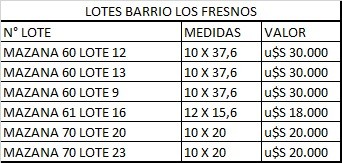 Tres terrenos de 10 x 37.6 U$S 30.000 Dos terrenos de 10 x 20 U$S 20.000 Un terreno de 12 x 15.6 U$S 18.000