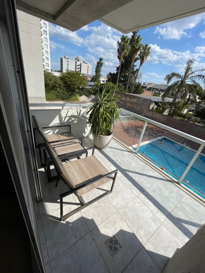 Impecable estado. Amplio living comedor con salida al balcon, cocina con comedor diario, lavadero, 2 dorm, toilette, baño principal, y cochera. Edificio con pileta.-