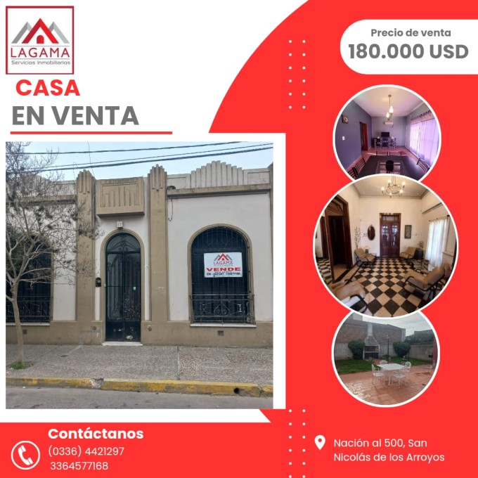 CASA | EN VENTA Nación al 500, San Nicolás de los Arroyos. 3 dormitorios. 1 Baño. Living. Cocina Comedor. Patio. Terraza. $ 180.000 USD.