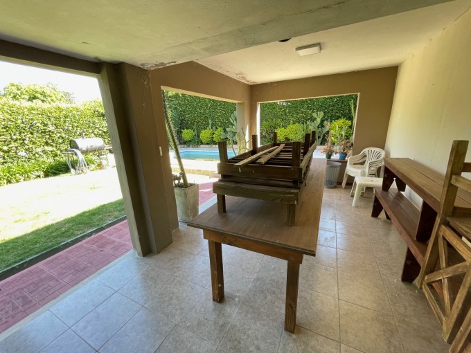 PA: Amplia casa de tres dormitorios, dos baños, living comedor, cocina, galería cerrada con parrillero y cocina, lavadero, balcón a la calle, patio verde en PB con quincho abierto, baño piscina, galería cerrada, cochera para dos vehículos y depósito. Todo en buenas condiciones.-