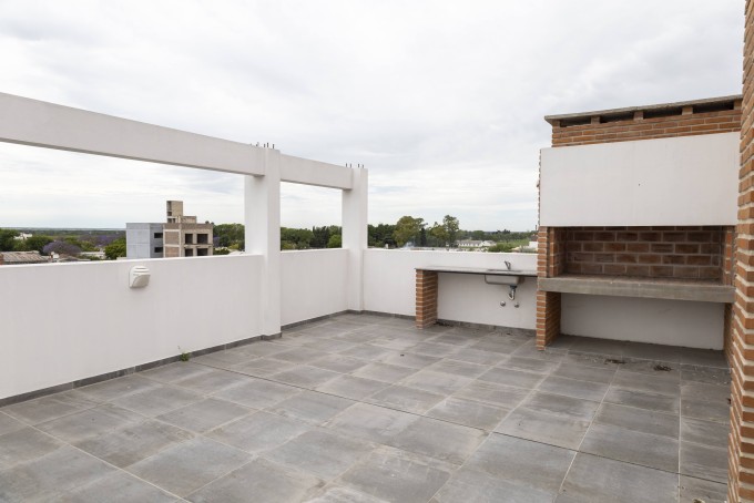 Acceso desde el departamento a la terraza ubicada en la planta 5 de uso exclusivo de 42 m² aproximadamente con parrillero, mesada y baño. Impresionante vista a la ciudad y el río.