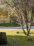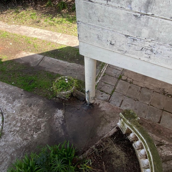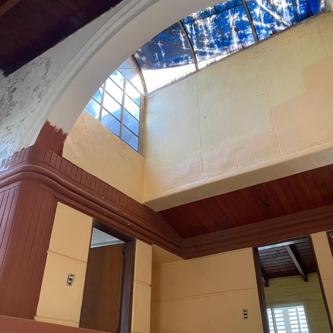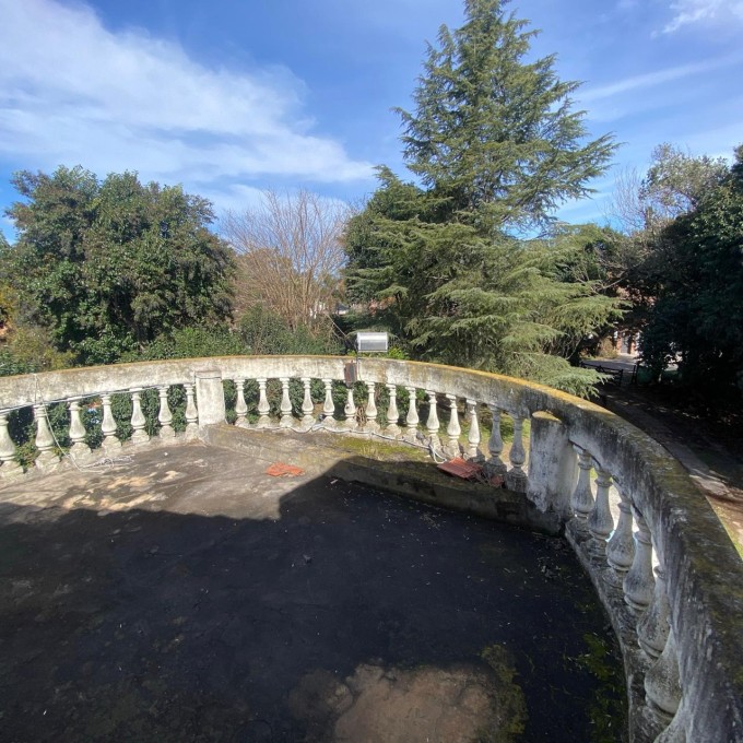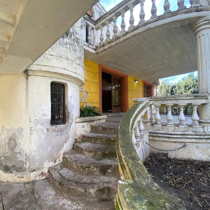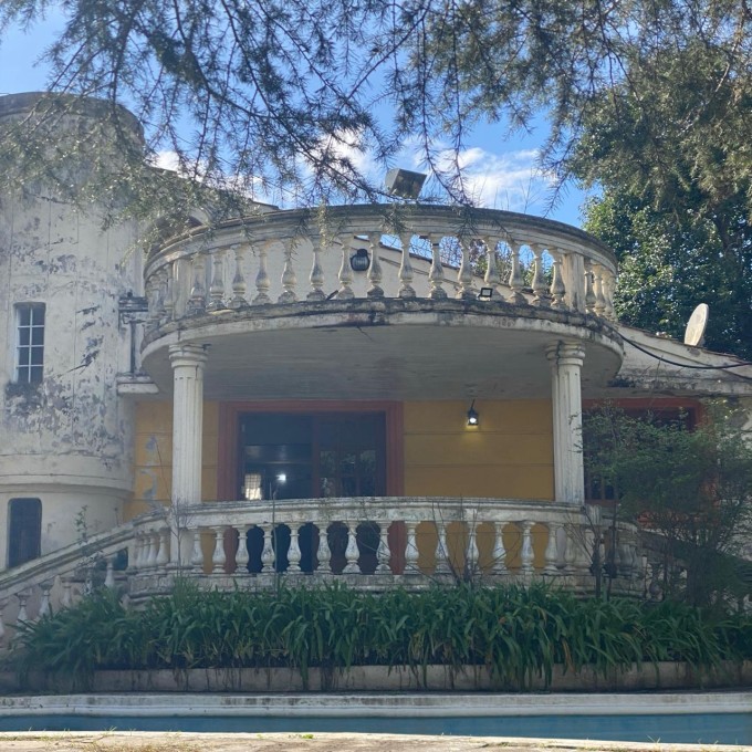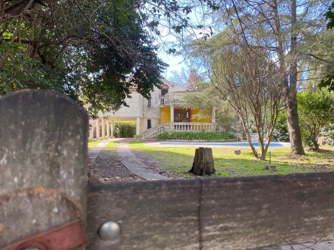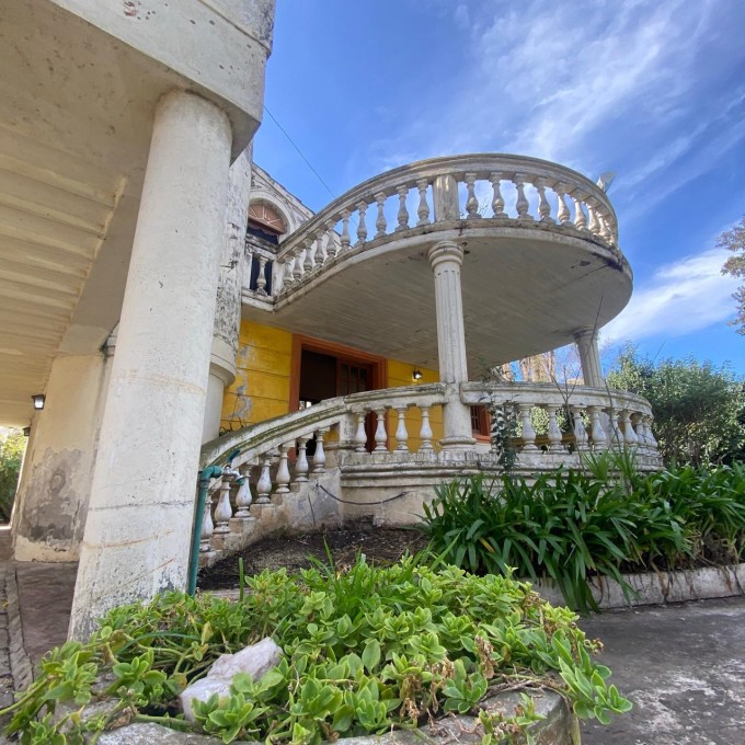 Al llegar nos recibe un parquizado con gran arboleda y una piscina que se integra perfectamente con la arquitectura curva de la casa. Una escalinata nos lleva al balcón semicircular de ingreso, donde una elegante balaustrada acompaña nuestro recorrido. Dos columnas inspiradas en el estilo dórico sostienen a la terraza que replica la misma forma y diseño.