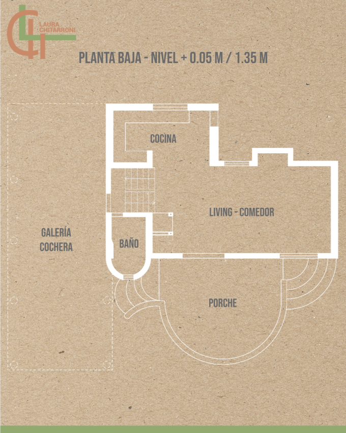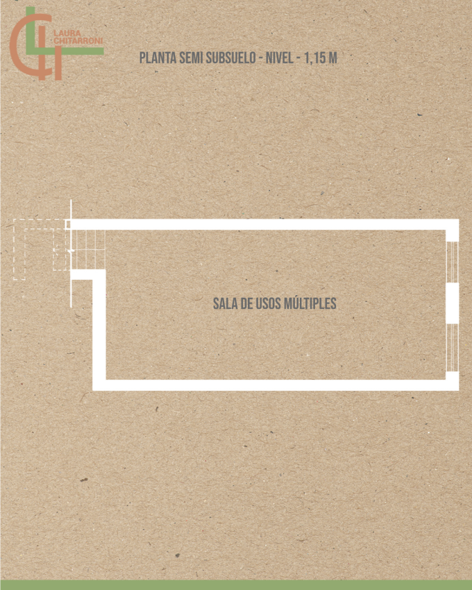 Ya en el interior se despliega el living comedor en doble altura con cocina integrada, al que también se accede desde la galería semicubierta ubicada en uno de los laterales de la casa. Junto al acceso de servicio, hay un baño y una escalera que desciende a un salón de usos múltiples semienterrado iluminado con luz natural.
