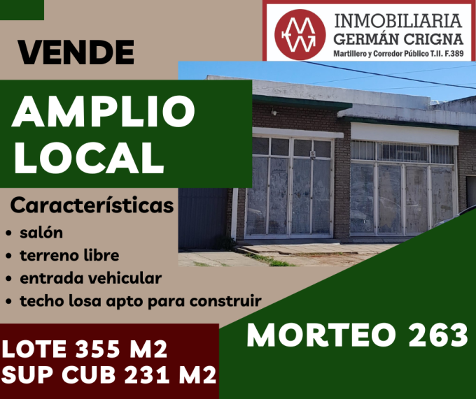 amplio salón comercial con entrada vehicular, techo de losa apto para construcción, terreno libre. Lote: 355 m2 - Superficie cubierta: 231 m2