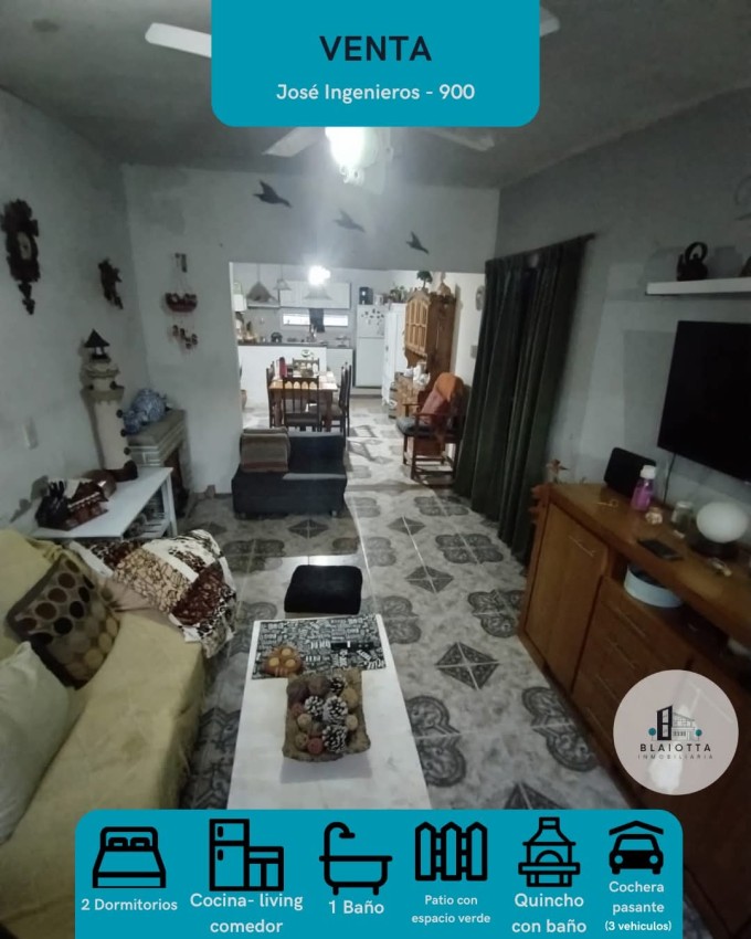 La propiedad posee 2 dormitorios, baño, cocina-comedor-living, quincho con baño, cochera pasante (espacio para 3 vehículos) y patio con espacio verde.