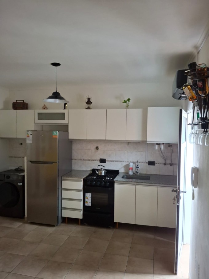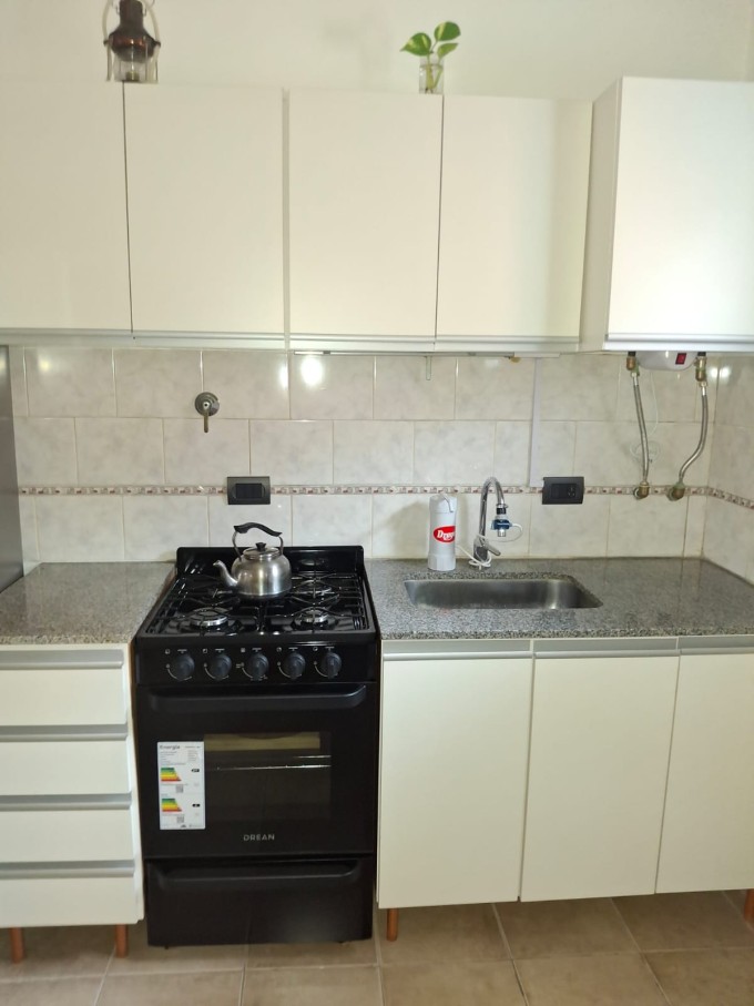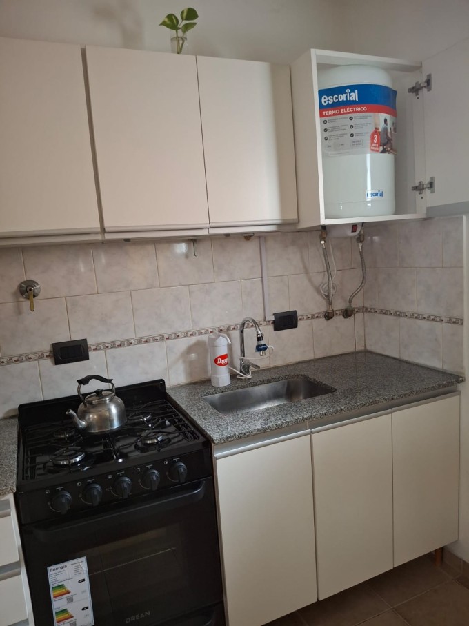 La propiedad cuenta con un ambiente amplio y luminoso, con sector de descanso y espacio para living/comedor. Posee cocina integrada totalmente equipada, con mobiliario completo bajo mesada y alacenas, artefacto de cocina y espacio para heladera.